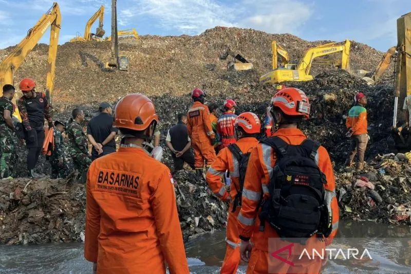 Sejumlah personel Badan Nasional Pencarian dan Pertolongan (Basarnas) melakukan pemeriksaan TPA Bantar Gebang Desa Ciketing Udik, Kecamatan Bantar Gebang, Kota Bekasi yang longsor pada, Minggu (8/3/2026). ANTARA/HO-Basarnas