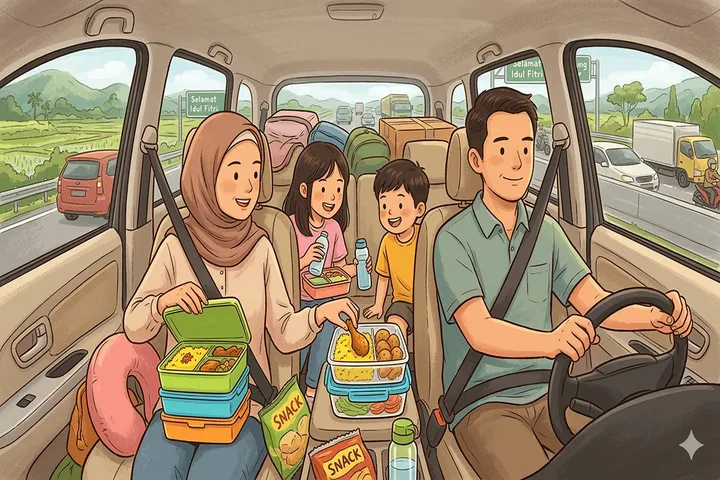 Ilustrasi awa bekal di perjalanan saat mudik / Gemini AI /