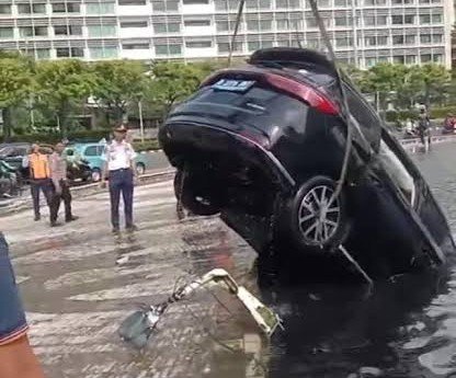 Dalam video yang diunggah di akun tersebut, terlihat proses evakuasi dilakukan menggunakan mobil derek Dishub untuk mengangkat mobil yang terbenam di kolam air mancur.(okezone)