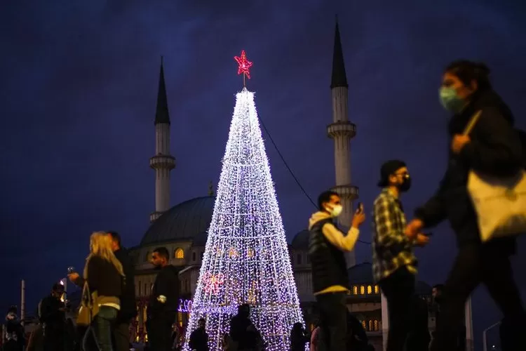 Foto: Pejalan kaki berjalan melewati pohon Natal di samping Masjid Taksim di alun-alun Taksim di Istanbul, Turki. (AP/Francisco Seco)