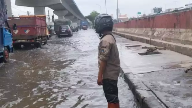 Petugas memantau kondisi Jalan RE Martadinata, Papanggo, Tanjung Priok yang terendam banjir rob pada Kamis (6/11). Sumber : Antara